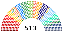 There are 513 deputies in power. Deputies are elected by proportional representation. This is done through dividing all the votes by the number of seats available. The number found is the election quotient. It is important to note that each party’s vote share comes from their specific candidate shares. The votes for a specific party are then divided by the election quotient, and the party quotient is settled. Such calculations are called large remainder Hare quota.[9]