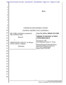 In 2019, Green Leaf Lab filed a complaint ending in a legal battle that became part of a critical issues around the need to protect proprietary lab procedures and issues of transparency around the emergent cannabis industry's regulatory standards in analytical chemical testing of cannabis potency.[23][24][25] Accusations of improriety were dismissed in U.S. California Central District Court. (see thumbnail for Order to Dismiss with Prejudice).