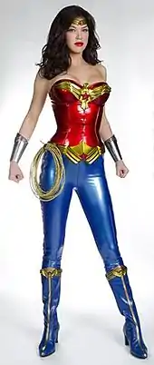 Reports surfaced in October 2010 that Warner Bros. Television was teaming with writer-producer David E. Kelley to pitch a new Wonder Woman television series to networks.[6] The major networks all turned down the series,[7] but NBC, the final network to initially pass on the project, ordered a pilot in January 2011. Jeffrey Reiner was hired to direct the pilot the following month.[8] The same month, Adrianne Palicki was selected to play the title role.[9] Lynette Rice of Entertainment Weekly commented that compared to Lynda Carter's costume, Palicki's costume de-emphasized patriotism and played up the character's Greek mythological origin.[10] Lynda Carter herself said Palicki looked gorgeous.[11] Kyle Buchanan of New York stated the costume "looked less like a superhero outfit and more like a Project Runway challenge gone awry, the kind of thing Nina Garcia would dismiss by sniffing, 'Shiny, cheap, and tacky'".[12] Borys Kit of The Hollywood Reporter pointed out that the costume was causing a divide, with many exclaiming it was "too trashy and too bad porn-y".[13] After the first official images of Palicki in costume were revealed, Fox News republished a story criticizing the loss of Wonder Woman's American symbolism.[14] Warner Bros. later changed the costume, replacing the blue boots and rubbery pants, due to fan criticism,[15] but in the episode "Gorilla My Dreams" of Kelley's show Harry's Law, Erica Durance (best known as Lois Lane from the television series Smallville) as Annie Bilson, wears the original costume now with red boots.[16][17]
