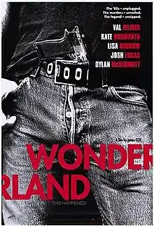 Wonderland is a 2003 American crime drama film, co-written and directed by James Cox and based on the real-life Wonderland Murders that occurred in 1981. The film stars Val Kilmer, Kate Bosworth, Dylan McDermott, Carrie Fisher, Lisa Kudrow, Josh Lucas, Christina Applegate, Tim Blake Nelson, and Janeane Garofalo. Kilmer plays the role of John Holmes, a famous pornographic film star and suspected accomplice in four grisly murders committed in a house at 8763 Wonderland Avenue, in the Laurel Canyon section of Los Angeles.