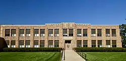 Woodbine Normal and High School was built in 1910. It is a two-story brick structure built on a raised basement and capped by a hipped roof. It has a limestone belt course between the basement and the first floor, and simple corbel panels between the second and third floors. The main entrance located on the south facade is set within a 1½-story projecting pavilion. The building was designed by the Kansas City, Missouri, architect John P. Eisentraut. The grade school building is a two-story brick building. Built in 1931, it was designed in the Art Deco style by the Des Moines architectural firm Dougher, Rich and Woodburn. It has a large limestone tablet over the main entrance with decorative floral motifs and the inscription, "Woodbine Grade School". A two-story brick structure from 1992 connects the two buildings. It replaced the original single story connector from 1931. The buildings were listed on the National Register of Historic Places in 2002.[1]