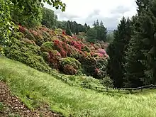 The steep garden at Cragside in Northumberland, created from the 1860s until about 1880, "may be regarded as the pioneering example" of this type of woodland garden, copied by several other gardens in the next three decades.[34] The very large areas of garden developed by the rich in the early 20th century therefore used relatively cheap land, that was often already woodland. Some woodland gardens, like Sheffield Park Garden in East Sussex, took over a park laid out in the 18th-century English landscape garden style, in that case worked on by both Capability Brown and Humphry Repton.[35] They also needed fewer gardeners per acre than intensive formal Victorian plantings. The style spread from the rich to the comfortably-off suburban middle-class.[36] According to Charles Quest-Ritson, "The William Robinson style of woodland garden, colourfully planted with exotic shrubs and herbaceous plants, dominated English horticulture from 1910 to 1960".[37]