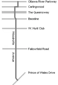 Woodroffe Avenue (Ottawa Road #15) is a major north-south arterial road in Ottawa, Ontario, Canada's west end. It runs south from the Sir John A. Macdonald Parkway through Baseline Road and Barrhaven to just short of Prince of Wales Drive near Manotick. The road runs through the heart of Nepean in Ottawa's west end. A satellite Via Rail station (Fallowfield station) is also located at the intersection of Fallowfield Road.