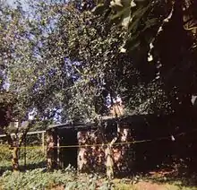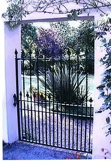 A duck pond was located nearby, but no sign of this remains. A number of white glazed earthenware eggs have been found in the soil around this spot, being used to encourage a broody hen or duck to lay more eggs. Cherry laurel bushes bordered the lawn on the right facing the bottom of the garden, together with a boat-shaped box hedge. The path was edged with stones that seem to have been removed from a "Devon hedge", judging by their size and type. Rose of Sharon shrubs lined the path running to the old school room at the front of the house. Barked-wood poles were used to construct the arches that covered three of the exits from the front lawn, each having trailing roses trained onto them.