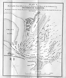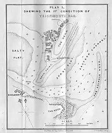The main improvements were never carried out, however some dredging works were implemented in 1857 near the Den Point following complaints from mariners. In 1865 yet further dredging works were carried out, and a groyne 330 yards long was later built out from abreast of Ferry Point to arrest sand.[11] Spratt also published a plan of the revolving movements of the sands at the Exmouth Bar.[8]