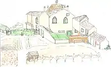 In the back garden of the house is a red sandstone building, cobbled inside, which was used latterly as the woodshed and fuel store (paraffin, diesel, etc.) A collapsed stable lay to the right-hand side as viewed from the front. The floor was lined with bricks with a central drainage channel and drain. This building had been two stories high and was probably used for the farm horses, the coach or "trap" horses, usually hackneys[4] being kept in the stable off from the central courtyard of the old farm buildings. Near the old greenhouse in the back garden was an "apple rack" with several drawers for storing the crop from the orchard. This apple rack was used until the 1970s when the structure became unsound and was not replaced. The rack can be seen in the drawing illustrated here.