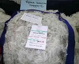 The finest bale of wool ever auctioned sold for a seasonal record of 269,000 cents per during June, 2008. This bale was produced by the Hillcreston Pinehill Partnership and measured 11.6 microns, 72.1% yield and had a 43 Newtons per kilotex[1] strength measurement. The bale realised $247,480 and was exported to India.[2]