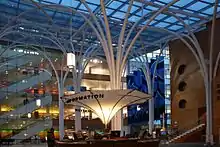 The Indianapolis Central Library addition and atrium project (2007) was Woollen Molzan's largest commission and the final one before Evans Woollen III retired from the firm. The project included restoration of the Indianapolis Public Library's historic Central Library, which was designed by Paul Philippe Cret and built in 1917, and a new, six-story curved-glass and steel structure that connected to the Cret building through an expansive atrium.[35] The firm was commissioned in 2001 to design the new building, but work was temporarily halted in 2004 due to construction problems and subsequent lawsuits. The Woollen Molzan firm was eventually released from the project, which cost an estimated $150 million; however, the library addition was completed in 2007 using its design. Woollen Molzan's lawsuit with the library was settled in 2006. The firm paid the library $580,000, but denied accusations that the building had design flaws, and the library paid the Woollen Molzan firm $130,000 in fees.[9][36] The library's structural consultants "were exonerated in court" in 2009; "it is generally accepted that the innocence extended to Woollen, Molzan too."[36]