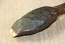 Records show that the implement began to be used about 5,000 years ago,[6] although the Mungo Man remains from at least 43,000 years ago show severe osteoarthritis in the right elbow associated with the use of a woomera.[7] It is still used today in some remote areas of Australia. Like spears and boomerangs, woomeras were traditionally used only by men. Some woomeras, especially those used in the central and western Australian deserts,[8] were multi-purpose tools.[9] Often shaped like long narrow bowls, they could be used for carrying water-soaked vegetable matter (which would not spill and could later be sucked for its moisture) as well as small food items such as little lizards or seeds. Many woomeras had a sharp stone cutting edge called a tula adze[10] attached to the end of the handle with black gum from the triodia plant. This sharp tool had many uses, such as cutting up game or other food and wood. It is supposed that the woomera could be used as a shield for protection against spears and boomerangs. The woomera is held in one hand while the other hand places the butt of the spear on the woomera's hook; the hollow curved shape facilitates this alignment without looking. The woomera effectively lengthens the thrower's arm, greatly increasing the velocity of the spear. Correcting for the game animal's lateral dodging is accomplished by tilting the wing-shape woomera during the throw for last-second corrections. The kinetic energy of a spear launched from a woomera has been calculated as four times that of an arrow launched from a compound bow.[6]