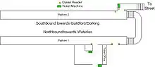 On Sundays, the service to London Waterloo reduces to 2 tph and the services to Dorking and Guildford are reduced to 1 tph each.