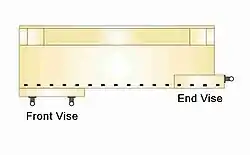 There are two main locations for a vise (vice in UK English sp.) or vises on a workbench: on the front, a workbench's long face, known as a "front" ("face", or "shoulder") vise, and on the end, known as a “tail" vise. Either or both may be mounted on the right side of their face to allow a workpiece extending from them to be more easily worked by a right-handed person, though a common arrangement is with the front vise mounted on the left of a long side and the tail on the right side of the diagonally opposite end.