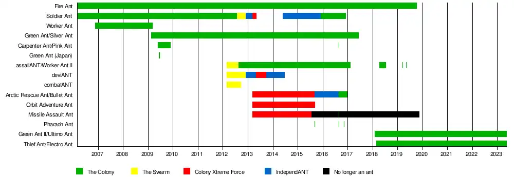 | Debut | Fire Ant and Soldier Ant: February 25, 2006[1][2] Worker Ant: November 17, 2006[3] Silver Ant: February 20, 2009[4] Carpenter Ant: May 24, 2009[5] Worker Ant (II): August 1, 2009[12] |