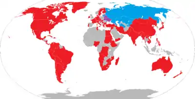 A new permanent organization emerged from the April 1949 conclave, the World Committee of Partisans for Peace.[1] At a Second World Congress held in Warsaw in November 1950, this group adopted the new name World Peace Council (WPC).[1] The origins of the WPC lay in the Cominform's doctrine that the world was divided between "peace-loving" progressive forces led by the Soviet Union and "warmongering" capitalist countries led by the United States, declaring that peace "should now become the pivot of the entire activity of the Communist Parties", and most western Communist parties followed this policy.[2]