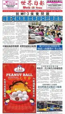 The World News (Chinese: 菲律賓世界日報; pinyin: Fēilǜbīn Shìjiè Rìbào; Pe̍h-ōe-jī: Hui-li̍p-pin Sè-kài Li̍t-pò, lit. "Philippine World News") is a daily broadsheet newspaper in the Philippines written in the Chinese language. Founded in 1981,[2] it is currently the Philippines' largest Chinese-language newspaper in terms of circulation,[3] with a circulation of 36,000 as of 2008.[1]