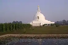 World Peace Pagoda (Nepali: विश्व शान्ति स्तूपा, Biswa Shanti Stupa), also called Nipponzan Peace Pagoda, is a Buddhist monument in Lumbini, Nepal. It was designed and built by Japanese Buddhists at a cost about a million US dollars.[1] The Pagoda acts as the starting point on the central axis of the Lumbini Master Plan, the other end being the Mayadevi Temple. The distance from the pagoda to the temple is about 3.2 km.[1] The stairs in stupa lead to three different levels. The stupa is whitewashed and the floor is stone-paved. It has four large golden statues of Buddha facing four directions.