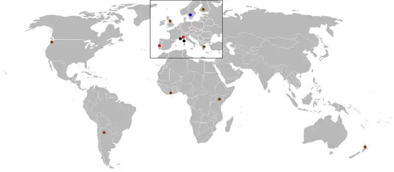 | Black = Tarmac | Brown = Gravel | Blue = Snow/Ice | Red = Mixed Surface |