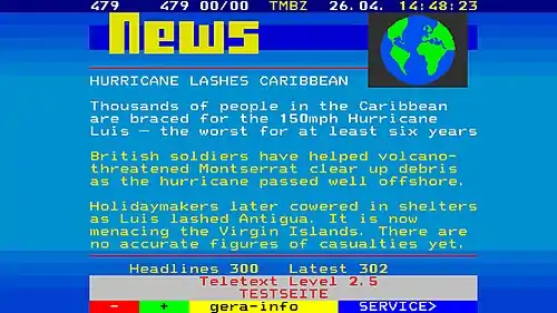 Level 2.5 or HiText.[9][4] was first broadcast in 1994 by the bilingual French-German channel ARTE. With Level 2.5 it is possible to set a background colour and have higher resolution text and images. The system was adopted initially by ARTE, ARD, ZDF, Bayern 3 and SwissTXT.