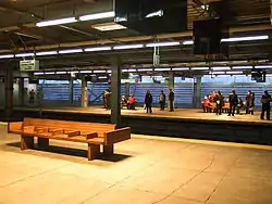 The Hudson Terminal station closed on July 2, 1971, to allow a three-day maintenance period to divert service to the World Trade Center PATH station.[34] The new PATH station opened on July 6, 1971, west of the original terminal.[35] Larger balloon loops in the PATH station platform allowed 10-car trains; the previous station with its tight loops could only handle trains of up to 6 cars.[32] When the station opened, it had nine high-speed escalators between the platform level and the mezzanine level.[33] The WTC PATH station was served by Newark–World Trade Center and Hoboken–World Trade Center trains. The station was connected to the World Trade Center towers via an underground concourse and a shopping center. There were also underground connections to the New York City Subway (A, C, and E trains at World Trade Center, and N, R, and W trains at Cortlandt Street–Church Street). By 2001, the volume of passengers using the WTC PATH station was approximately 25,000 daily.[36] While the construction of the World Trade Center neared completion, a temporary corridor was provided to take passengers between the station and a temporary entrance on Church Street.[33]