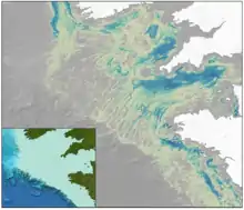 ![]() Bathymetry of the ocean floor showing the continental shelves and oceanic plateaus (red), the mid-ocean ridges (yellow-green) and the abyssal plains (blue to purple) The productivity of marine fisheries is largely determined by marine topography, including its interaction with ocean currents and the diminishment of sunlight with depth. ![]() Fishing activities extracted from Automatic Identification Data of EU trawlers over the continental shelf,[2] highlighting the correlation with the bathymetry over the area (bottom-left, from the GEBCO world map 2014). Marine topography is defined by various coastal and oceanic landforms, ranging from coastal estuaries and shorelines; to continental shelves and coral reefs; to underwater and deep sea features such as ocean rises and seamounts. |