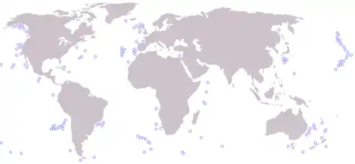 ![]() The locations of the world's major seamounts A seamount is an underwater mountain, rising from the seafloor that does not reach to the water's surface (sea level), and thus is not an island. They are defined by oceanographers as independent features that rise to at least 1,000 meters above the seafloor. Seamounts are common in the Pacific Ocean. Recent studies suggest there may be 30,000 seamounts in the Pacific, about 1,000 in the Atlantic Ocean and an unknown number in the Indian Ocean.[39] |