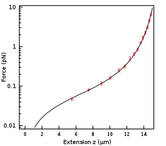 Experimental data from the stretching of Lambda phage DNA is shown to the right, with force measurements determined by analysis of Brownian fluctuations of a bead attached to the DNA. A persistence length of 51.35 nm and a contour length of 1318 nm were used for the model, which is depicted by the solid line.[4]