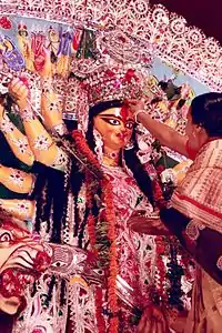 In Hinduism, a murti typically refers to an image or statue which expresses a Divine Spirit (murta). Devotional (bhakti) practices centered on cultivating a deep and personal bond of love with God often include veneration of murtis. Acts of devotion can include awakening the murti in the morning and making sure that it "is scrubbed, clothed, and garlanded."[1] Furthermore, the building of a temple for the murti is considered the highest act of devotion.[1] Some Hindu denominations like Arya Samaj[2] and Brahmo Samaj, however, reject it, equating it with an idol worship.