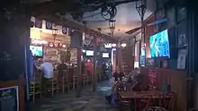 The building is triangular in shape, with the back of the building reduced to a point and an entrance door located at another streetside point. A center front-facing door previously led to the upper floor but now opens at the bar. During Prohibition the premises were still in use as a tavern, though local ownership records from 1924–1933 show it was a "restaurant" serving "beverages" and "soft drinks".[1] A secret panel behind the bar and above a built-in ice box reveals a hiding place for various bottles of spirits.[1]