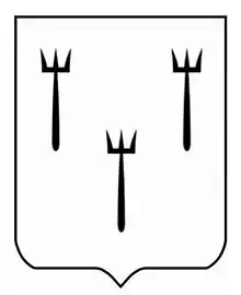 Dating from the 15th century, the Worthington coat of arms is argent, three dung forks sable.[8] The arms can be considered a rebus, “worthing” being an archaic slang term for dung. The crest is a goat statant argent, holding in the mouth an oak branch vert, fructed or; the motto, "Virtute Dignus Avorum" (in virtue worthy of ones ancestors).[9] The motto and coat of arms may be seen in Chorley Church, Winslow Parish, Cheshire, England.[10][11]