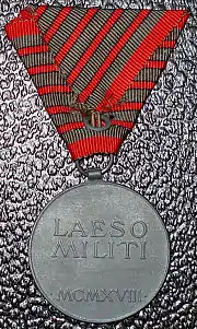 | Description | Zinc medal with bust of Emperor Karl on the obverse and the words LAESO MILITI and the date MCMXVIII on the reverse, suspended from a trifold ribbon. |