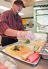 The wrap in its Western form probably comes from California, as a generalization of the Mexican and Tex-Mex burrito, and became popular in the 1990s.[1] It may have been invented and named at a southern California chain called "I Love Juicy" in the early 1980s.[2][3] Shortly after the Box Lunch restaurant opened in 1977 in Wellfleet Massachusetts, the "Rollwich" became their signature menu item. [4] The OVO Bistro in NYC introduced its wrap sandwich in 1990 under the name "The King Edward," The Bobby Valentine Sports Gallery Cafe in Stamford, Connecticut, is sometimes claimed to have invented the wrap at about the same time, but Valentine is diffident about it: "Well, that's legend and folklore, but until somebody disputes me or comes up with a better story, I'll say I invented the wrap." Beth Dolan of Stamford, Connecticut, is the waitress credited for serving the first wrap after the restaurant had run out of bread. Moreover, Valentine's own story dates his use of the name 'wrap' to the mid-1990s, after it is documented in California.[5] San Francisco-based chain World Wrapps, which opened its first location in February 1995, is credited with popularizing the wrap nationwide.[6] In 1988, Jeff Fairhall of Seattle created the Essential Sandwich – a rice and veggie wrap – which he distributed to local health food stores. Within four years, he was making 10,000 wraps a week sold at 220 locations in Seattle.[7]