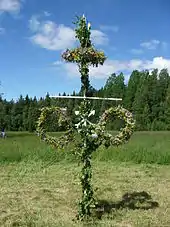 On the eve of the Feast of Corpus Christi, Christian clergy (chiefly those from the Roman Catholic, Lutheran, and Anglican traditions) bless Corpus Christi wreaths that are made of flowers.[27] Wreaths and bouquets are often "attached to flags and banners, to houses, and to the arches of green boughs that span the streets."[27] In Christian homes, these wreaths are suspended on walls or displayed on doors and in windows.[27] Corpus Christi wreaths are also "put up in gardens, fields, and pastures, with a prayer for protection and blessing upon the growing harvest."[27]