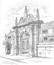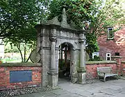 The arched stone gateway is flanked by Tuscan columns resting on pedestals, and has prominent side scrolls, one of which has been restored. The entablature above the arch is topped with coping in Jacobean style.[2][3] English Heritage describes the structure as "a fine gateway", while Pevsner calls it the "best" feature of the almshouses.[2][3] It was originally painted and gilded.[5] The archway is surrounded by a low red-brick wall with a stone coping.[2] A modern commemorative tablet in the wall to the left of the archway records the amalgamation of the almshouse charities; it was dedicated on 24 November 1973.[9]