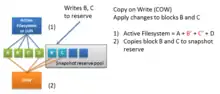 Blocks are allocated when written using a block map, which keeps track of which blocks are in use and which blocks are free. An entry in the block map contains a bit indicating whether the block is in use in the current version of the file system and several bits, one per snapshot, indicating whether the block is in use in the snapshot. This ensures that data in a snapshot is not overwritten until the snapshot is deleted. Using block map all new writes and rewrites are written to new empty blocks, WAFL only reports that block rewrite successful, but no rewrites actually occur, this approach called Redirect-on-write (ROW) technique.[4] ROW is much faster on rewrite operations compare to Copy-on-write where old data block going to be rewritten in-place and captured in a snapshot needs to be copied first to space allocated for snapshot reserve in order to preserve original data, this generates additional data copy operations once system get rewrites to that block.