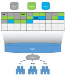 Each Flexible Volume (FlexVol) is a separate WAFL file system, located on an aggregate and distributed across all disks in the aggregate. Each aggregate can contain and usually has multiple FlexVol volumes. ONTAP during data optimization process including the "Tetris" which finishes with Consistency Points (see NVRAM) is programmed to evenly distribute data blocks as much as possible in each FlexVol volume across all disks in aggregate so each FlexVol could potentially use all available performance of all the data disks in the aggregate. With the approach of even data block distribution across all the data disks in an aggregate, performance throttling for a FlexVol could be done dynamically with storage QoS and does not require dedicated aggregates or RAID groups for each FlexVol to guarantee performance and provide the unused performance to a FlexVol volume which requires it. Each FlexVol could be configured as thick or thin provisioned space and later could be changed on the fly any time. Block device access with storage area network (SAN) protocols such as iSCSI, Fibre Channel (FC), and Fibre Channel over Ethernet (FCoE) is done with LUN emulation similar to Loop device technique on top of a FlexVol volume; thus each LUN on WAFL file system appears as a file, yet have additional properties required for block devices. LUNs can also be configured as thick or thin provisioned and can be changed later on the fly. Due to WAFL architecture, FlexVols and LUNs can increase or decrease configured space usage on the fly. If a FlexVol contains data, internal space can be decreased no less than used space. Even though LUN size with data on it could be decreased on WAFL file system, ONTAP has no knowledge about upper-level block structure due to SAN architecture so it could truncate data and damage the file system on that LUN, so the host needs to migrate the blocks containing the data into a new LUN boundary to prevent data loss. Each FlexVol can have its own QoS, FlashPool, FlasCache or FabricPool policies.