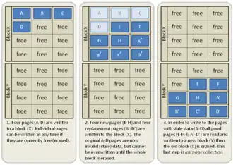 Pages are written into blocks until they become full. Then, the pages with current data are moved to a new block and the old block is erased.[2]
