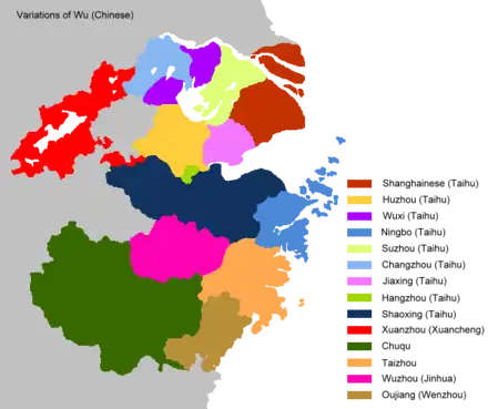 - Wu (simplified Chinese: 吴语; traditional Chinese: 吳語; pinyin: Wúyǔ, Shanghainese: [ɦu˨ ɲy˦]; Suzhounese: [ɦoʊ˨ ɲy˦]; Wuxinese: [ŋ˨˨˧ nʲy˨], 'Wu language'): the formal name and standard reference in dialectology literature.