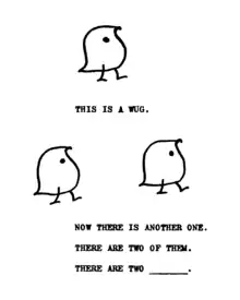 - This is a WUG. Now there is another one. There are two of them. There are two ________.[16]