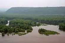 Wyalusing means "home of the warrior" in the Lenape language spoken by Munsee-Delaware tribes who settled in the area in the 19th century after being displaced from farther east. 500-foot-high (150 m) bluffs dotted with prehistoric Native American mounds look out over the river valleys. Two park resources have been recognized nationally: the Wyalusing Hardwood Forest is a National Natural Landmark and the Wyalusing State Park Mounds Archaeological District is on the National Register of Historic Places.