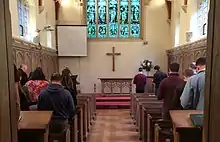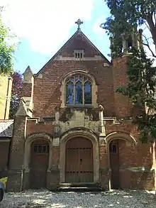 A chapel and bellcote was added between No. 54 and No. 52 in 1896, designed by architect George Wallace.[23] The chapel was opened by the Bishop of Oxford and has a stained-glass window depicting John Wycliffe. A vestry was added to the south side of the chapel in the 1930s, which is now being used as a prayer room. A 1961 reordering of the east end saw the introduction of candlesticks and altar frontals, which were removed in a later reordering. The 1960s metal reredos cross is now hung in the corridor between the main part of the hall and Old Lodge.