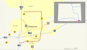 Wyoming Highway 212 begins at its southern end at Interstate 25 (Exit 7) and travels east and north around Cheyenne to Wyoming Highway 219 (Old Yellowstone Highway) north of Cheyenne.[2] Beginning at I-25, Wyoming Highway 212 runs concurrent with Business Loop I-25 and US 87 Business until an intersection with South Greeley Highway (US 85). After that intersection, WYO 212 passes Laramie County Community College and turns northward toward Interstate 80. WYO 212 intersects Fox Farm Road (former Wyoming Highway 221) at 5.1 miles (8.2 km) before heading north to an interchange with I-80. Between the Interstate 80 interchange and US 30 (Lincolnway), Wyoming Highway 212 runs concurrent with Business Loop I-80. After intersecting US 30, WYO 212 heads north and intersects busy Dell Range Blvd. which is a busy commercial strip for shopping and stores. WYO 212 then heads north and west around Cheyenne, taking on the name Four Mile Road.[2]