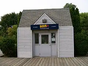 Wyoming railway station is a railway station in Plympton–Wyoming in Lambton County, Ontario, Canada. It is a stop on Via Rail's Toronto–Sarnia train route. The station is wheelchair accessible. The shelter is set back off of Broadway Street in downtown Wyoming. Train 84 stops in Wyoming at 08:56 and Train 87 stops at 22:05, seven days a week. Reservations are required 40 minutes in advance for trains 84 and 87 to stop at this location.[1]