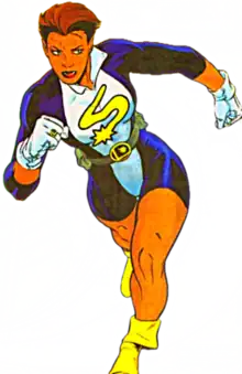 At the sight of her father Jeven Ognats of Aarok being tortured, her latent super-speed powers activated. She managed to escape with her father before stray fire from the Dominators caused their base to explode.[3] After this, she checked herself into a laboratory to help her learn to coordinate herself at super-speed. Once she learned control, she was drafted into the Legion of Super-Heroes. She eventually learned to overcome her initial fear and nervousness, while she developed crushes on Cosmic Boy and, later, M'Onel, and eventually dated Dyrk Magz.
