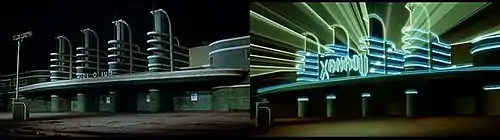 The Pan-Pacific Auditorium in Los Angeles was used for exterior shots of the nightclub. Xanadu's nightclub interior was built on Stage 4 of the Hollywood Center Studios (1040 N. Las Palmas Avenue, Hollywood) beginning in 1979.[6] Sonny refers to the Auditorium as "a dump", which was a fair characterization of the Pan-Pacific by then. Danny jokes that "they used to have wrestling here", which was a true statement about the Auditorium. The building would be consumed by fire a decade later.