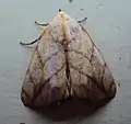 The wingspan of the female is 36 mm and male is 35–42 mm.[4] Palpi reddish brown and porrect (extending forward). Head, thorax and abdomen bright canary yellow. Vertex of thorax rufous. Legs reddish brown. Tibia with long hairs.[3] Forewings bright yellowish with distinct three brown arrow-shaped lines across each forewing. The caterpillars show remarkable color variations. A large bright rufous triangular patch is found over the whole outer area of the forewings. A black sub-apical speck visible. Cilia rufous. Hindwings reddish brown suffusion with rufous outer margin. The caterpillar is 35–40 mm in length.