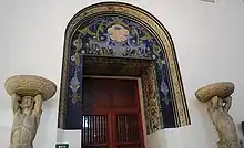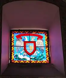 Another reason for his obscurity is that much of his work was done in collaboration with or in subordination to other artists.[6] He worked with Roberto Montenegro at the former San Pedro y San Pablo monastery on the El arbol de la vida mural and the design of the stained glass windows El Jarabe Tapatío and La vendedora de pericos.[1][7] He also designed the stained glass window with the seal of the Universidad Nacional Autónoma de México in the same building with Jorge Enciso.[1] In 1921, Guerrero met Diego Rivera and became one of the artists to paint the San Ildefonso College building, then the Escuela Nacional Preparatoria and the Anfiteatro Bolivar, mostly done in encaustics.[3][7] Under Rivera and Siqueiros, he became one of the painters of the Secretaría de Educación Pública building along with Amado de la Cueva and Pablo O'Higgins.[5][6] Despite the subordinate position, he was the one to teach Rivera how to prepare walls for fresco work.[2][4] He assisted on works by José Clemente Orozco, Carlos Mérida, Miguel Covarrubias and Adolfo Best Maugard.[3] With Gabriel Fernández Ledesma he designed the wainscot made of Talavera tiles for the mural work titled Zodiaco in 1921.[1]