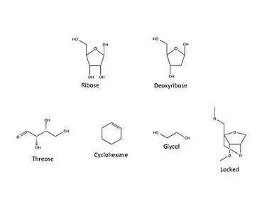 XNA exhibits a variety of structural chemical changes relative to its natural counterparts. Types of synthetic XNA created so far include:[2]