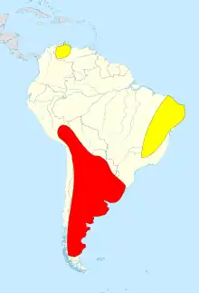 | Map showing the distribution of Macrauchenia in red, and Xenorhinotherium in yellow, inferred from fossil finds | |