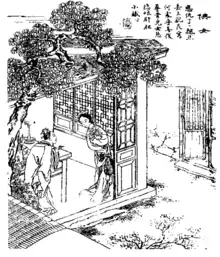 The earliest fictional works pertaining to the nüxia (女俠) or "female knight-errant", like "Nie Yinniang" (聶隱娘) and "Hongxian" (紅線), date back to the Tang dynasty, although they only became popular from the late Ming dynasty onwards.[5] Pu was evidently influenced by Tang nüxia stories; Karl S. Y. Yao suggests that Pu's main source was "Guren Qi" (賈人妻),[6] whereas Roland Altenburger argues that "the most likely point of reference" for "Xianü" was "Cui Shensi" (崔慎思), given the "greatest number of common elements" that both stories share.[7] Pu was believed to have written "Xianü" before 1688, making it one of the earlier Liaozhai zhiyi entries.[8]