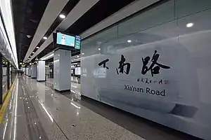 Xianan Road (Chinese: 下南路; pinyin: Xiànán Lù) is a station on Line 13 of the Shanghai Metro,[1] part of phase two of the line. Located at Chengshan Road and Jinxiu Road in the city's Pudong New Area, the station opened with the rest of phases 2 and 3 of Line 13 on 30 December 2018.[2][3]