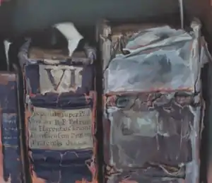 Xie's labor-intensive "Library" paintings[34] depict shelved books in large-scale close-up, revealing wear, human touch, and how objects are left.[31][26][20] He paints in what critics describe as a soft, brushy, almost impressionistic manner that captures the play of ethereal light, texture (crinkled parchment, frayed leather edges, pockmarks) and shadow;[26][4][35][36] his technique achieves precision but at times dissolves into near-abstraction or blurring that suggests a camera lens or the haze of memory.[37][21][35] Xie is sometimes linked to the realist and still-life traditions, but critics note several key differences: rather than stage tableaux, he photographs reference scenes as he finds them, composing in the viewfinder; he uses color subjectively, working in analytical near-black-and-white, warm red-brown-yellow, or almost-toxic greenish tones depending on his conceptual goals; he paints at a larger-than-life scale in which architectural presence de-familiarizes his subjects.[20][21][31][32] Kenneth Baker notes an interpretive openness in the work that can be read as elegiac, memorializing, cautionary, or critical, which is also foreign to traditional still life.[25][38]